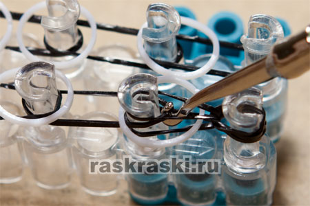 Станок с двумя рядами (открытые части левого ряда станка смотрят на вас, правого - от вас), крючок и резиночки двух цветов (у нас это чёрный и белый).