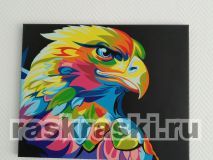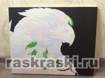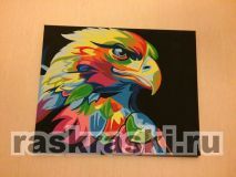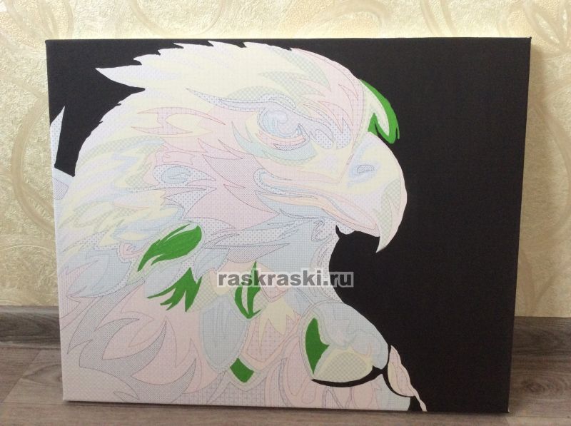 На синтетический холст нанесён контур будущего шедевра. Все области пронумерованы и соответствуют номерам на баночках с красками. Все, что нужно сделать - раскрасить каждый сектор тем номером краски, который в нем проставлен.