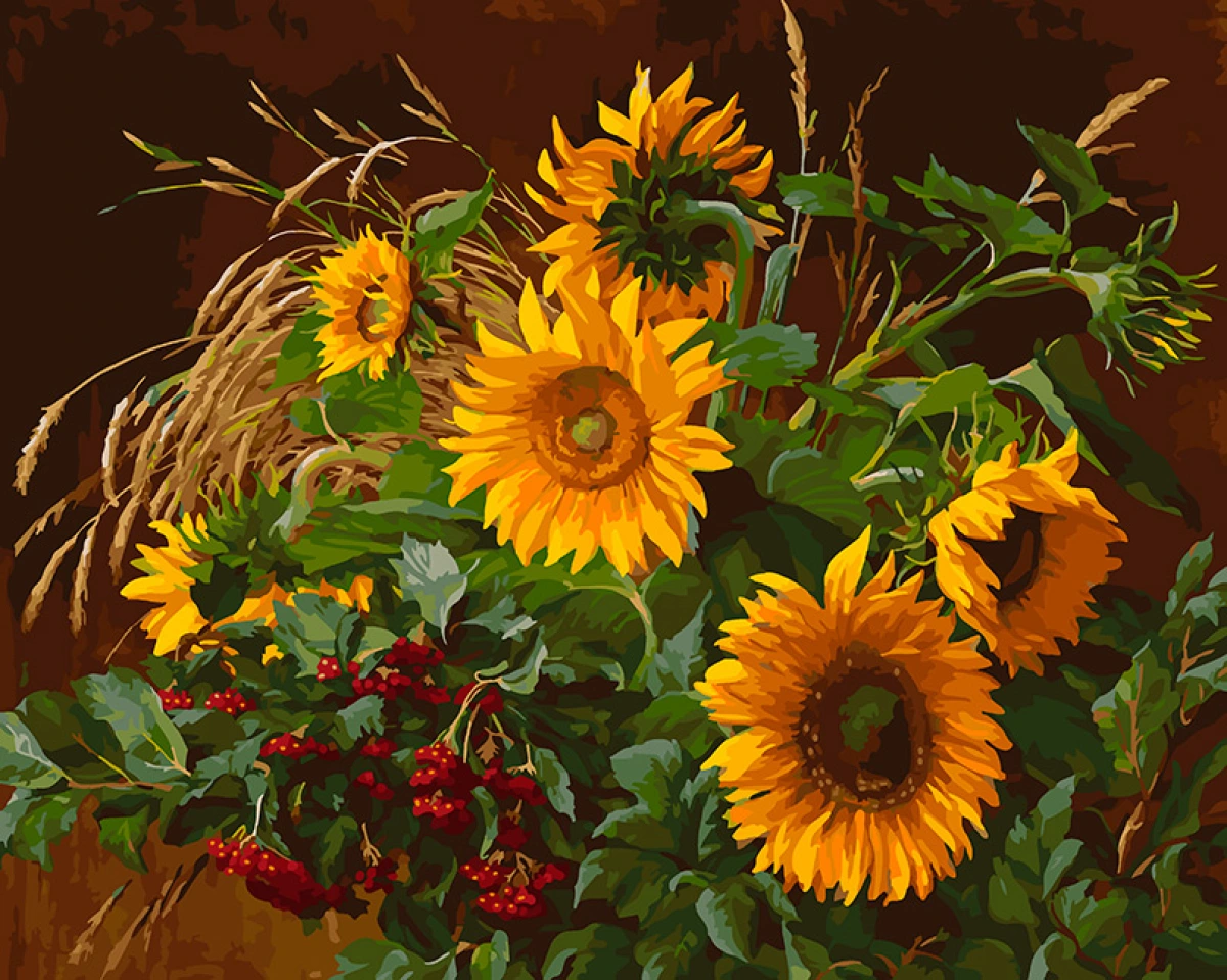 Белоснежка / Картина по номерам «Букет с подсолнухами и калиной»